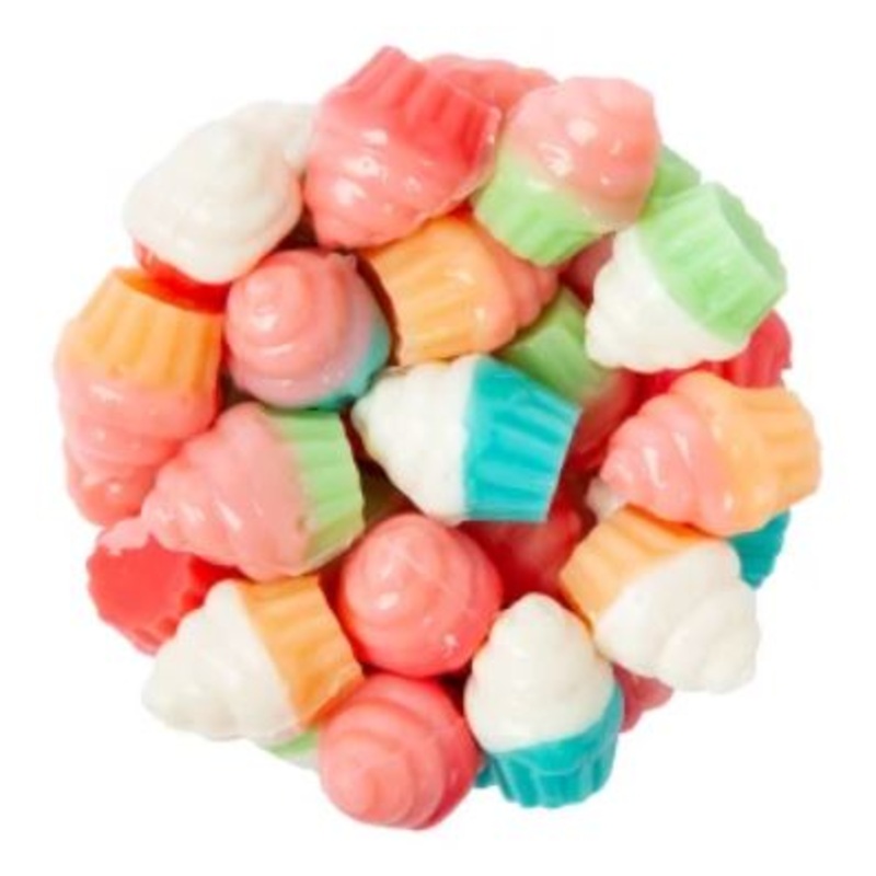 Sweet gummycupcakestopped withpink or white ‘frosting’in an assortment of cupcake ‘wrappers’.Perfect addition to your next birthday party or celebration.