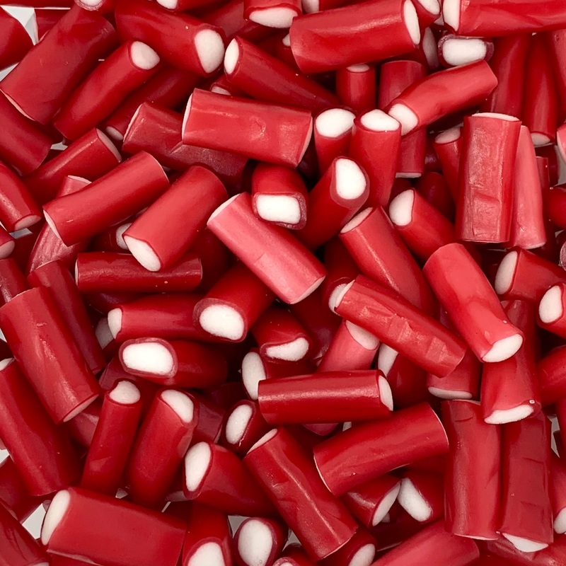 Delicious strawberry & cream flavoured pencil bites. Sweet strawberry liquorice wrapped around a creamy fondant filling!